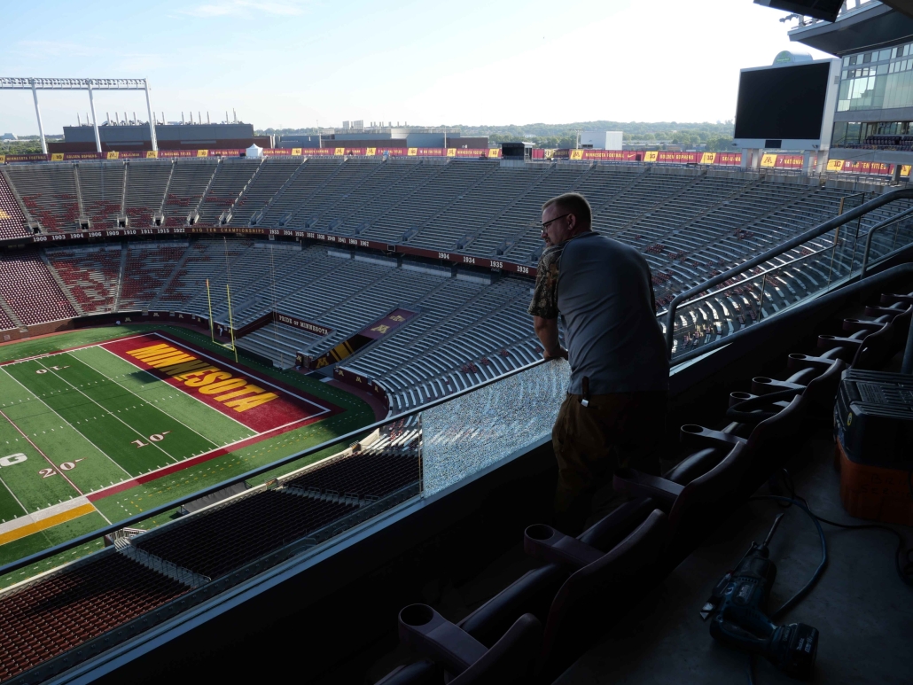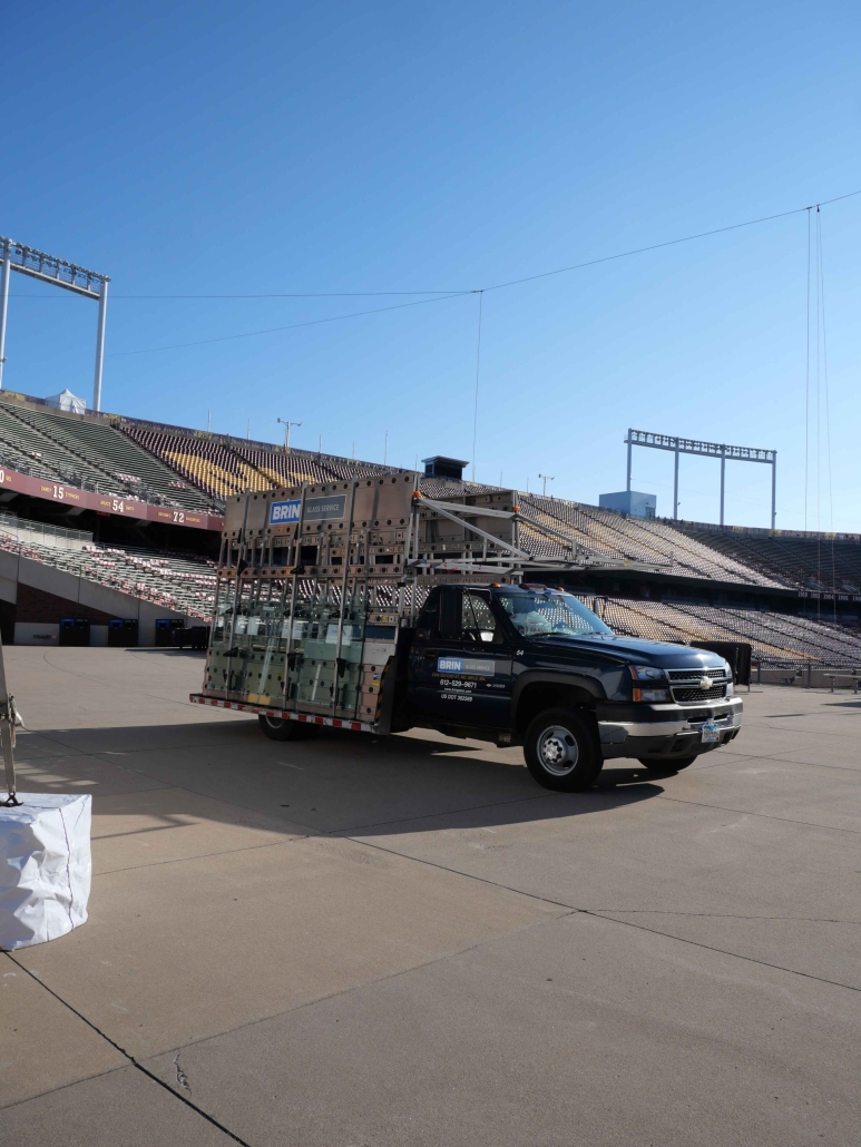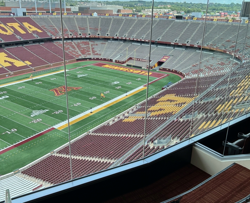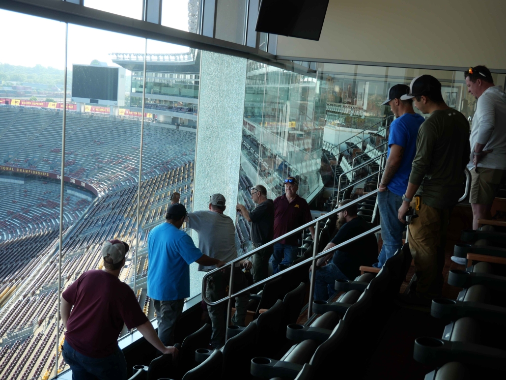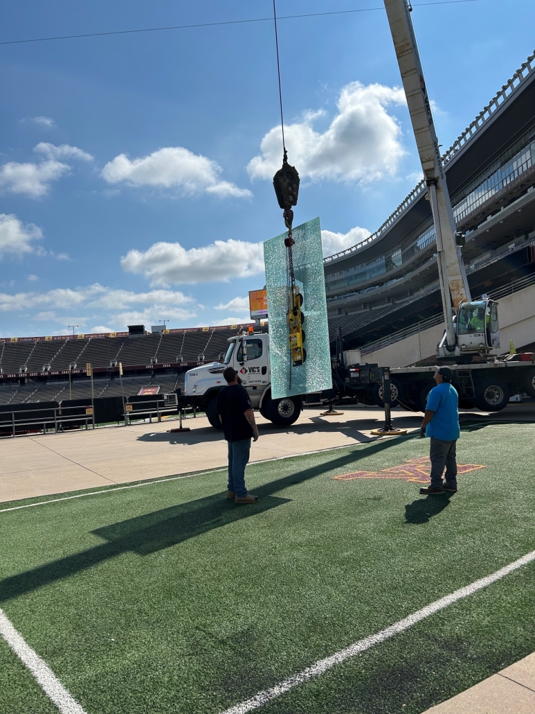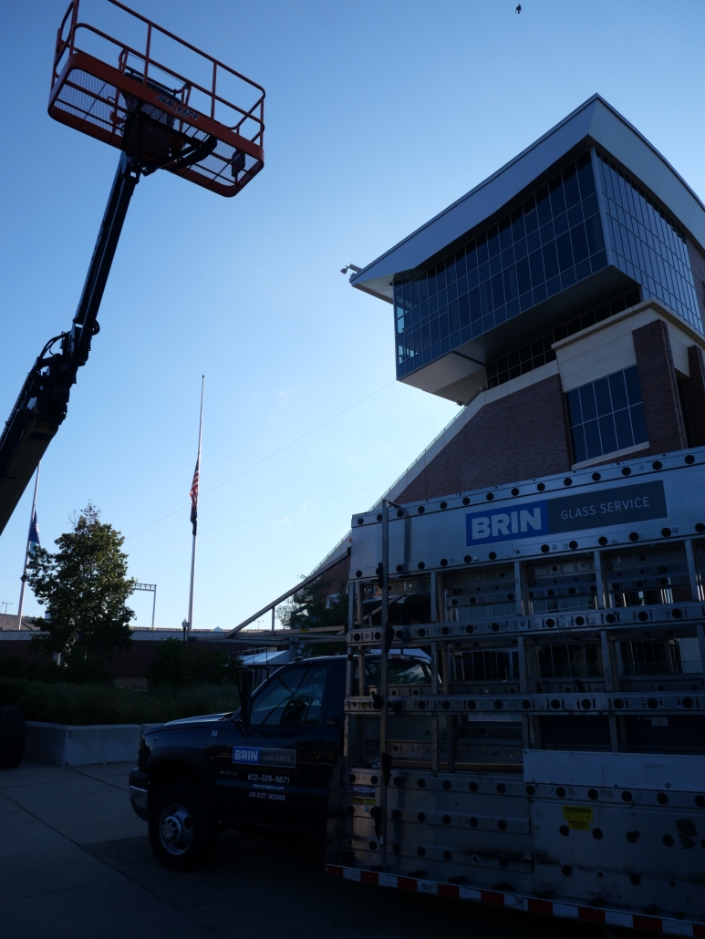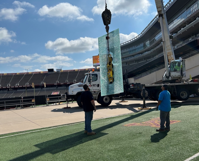 When one of the large windows inside the President’s Suite at Huntington Bank Stadium broke— along with several handrail glass panels in other suites—it presented a unique challenge. The President’s Suite window was both oversized and located in a difficult-to-access part of the stadium, requiring careful coordination of crane, lift operators and experienced glaziers to replace the tempered laminated glass.