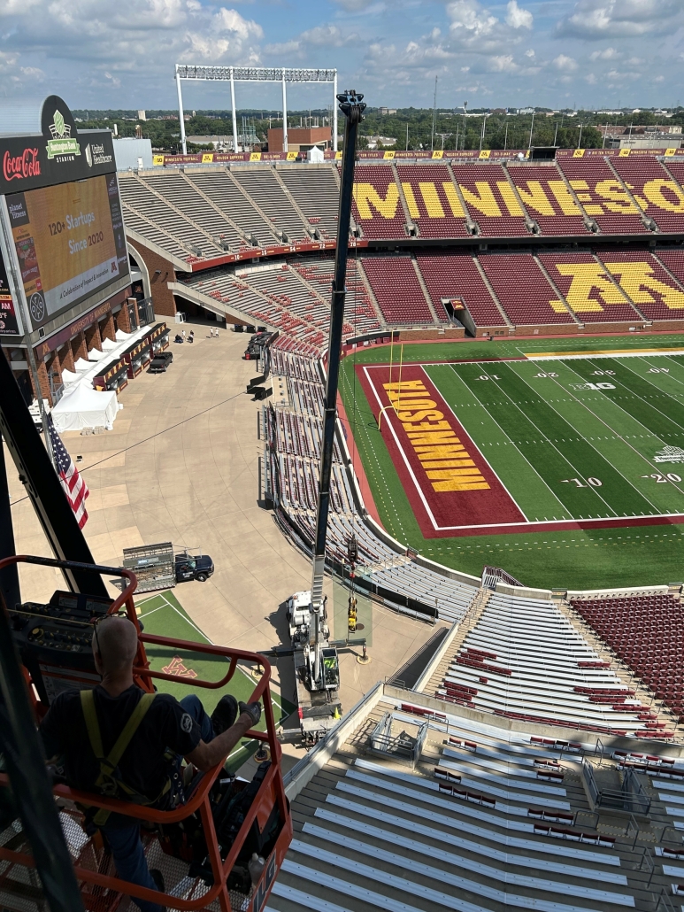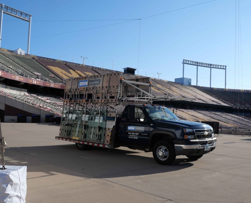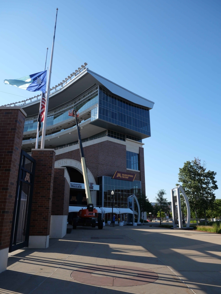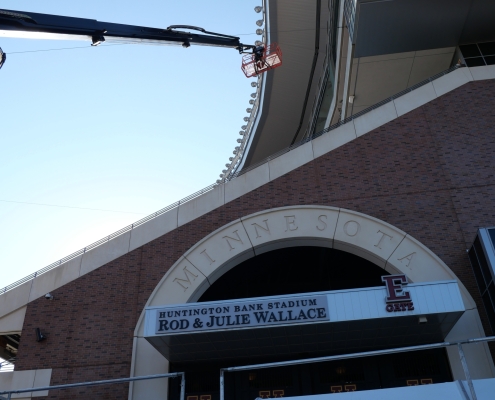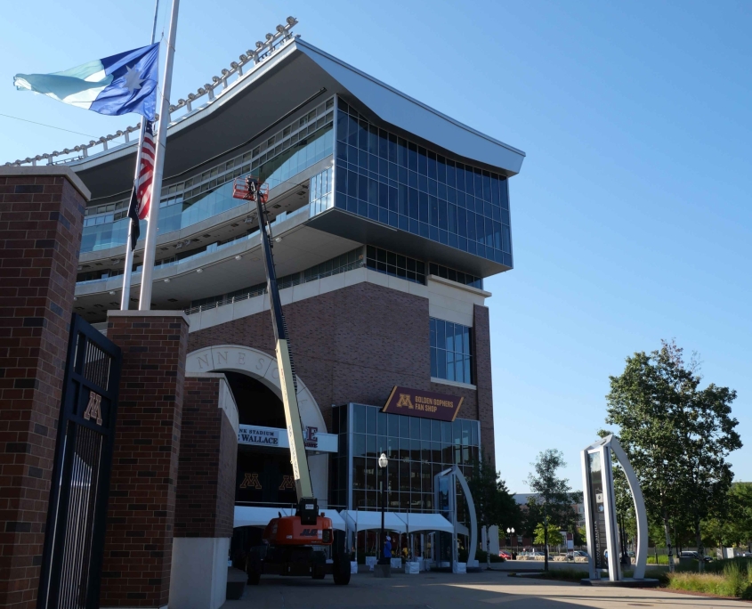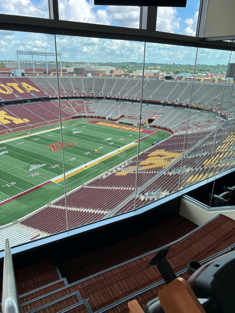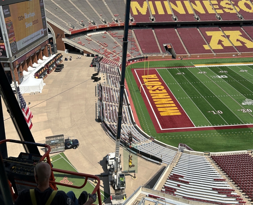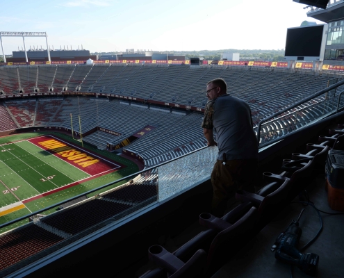 When one of the large windows inside the President’s Suite at Huntington Bank Stadium broke— along with several handrail glass panels in other suites—it presented a unique challenge. The President’s Suite window was both oversized and located in a difficult-to-access part of the stadium, requiring careful coordination of crane, lift operators and experienced glaziers to replace the tempered laminated glass.