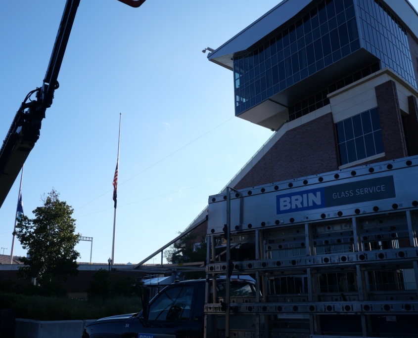 Brin’s service team quickly assessed the scope of work, measured for all replacements, and expedited the fabrication of the required glass through trusted vendor partners. Leveraging the strength and experience of our glazing team, 10 glaziers worked together to execute the project efficiently, ensuring the repairs were completed ahead of football season kickoff.